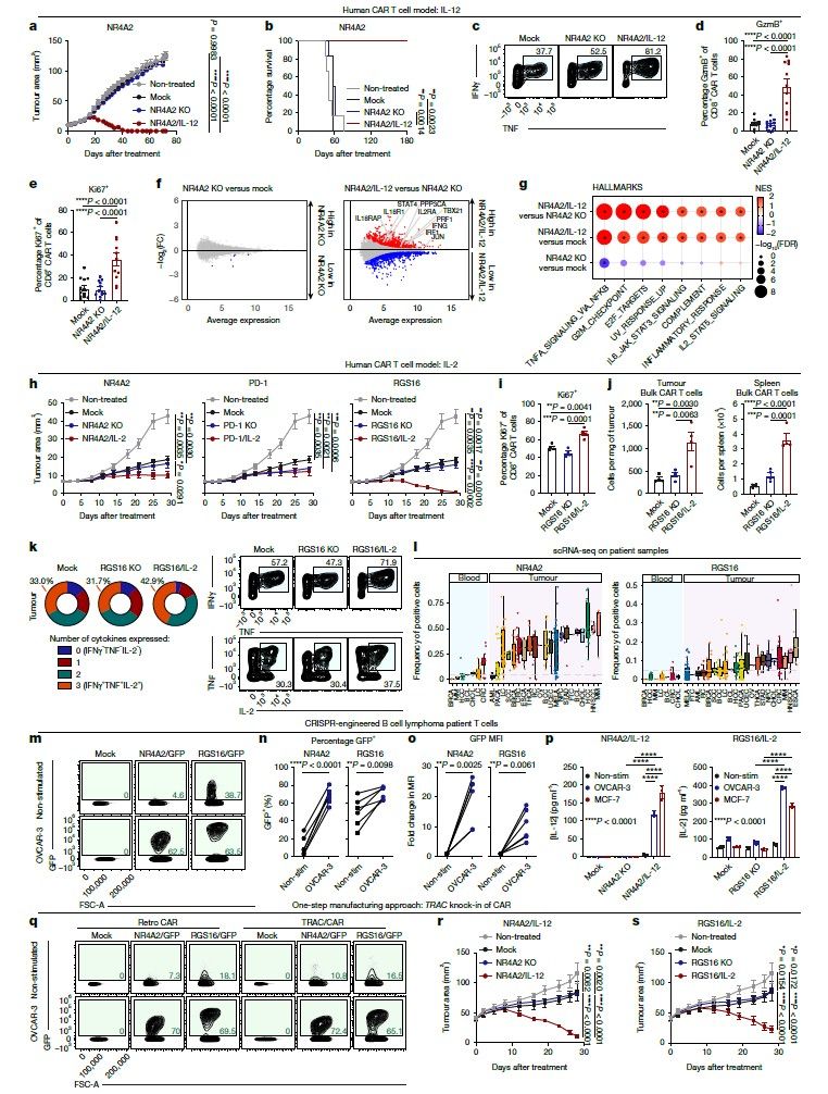 这是通过利用一种叫做启动子的天然“开关”来实现的。研究者们鉴定出了NR4A2和RGS16两种启动子,支持促炎因子的肿瘤靶向表达(递送)。研究进一步证明,分别通过NR4A2或RGS16启动子表达IL-12或IL-2可产生强大的治疗反应,而没有任何明显的毒性迹象。研究人员将基于这些发现开发的智能CAR-T细胞命名为“Precision Guided Munition (PGM) CAR T-cells”。