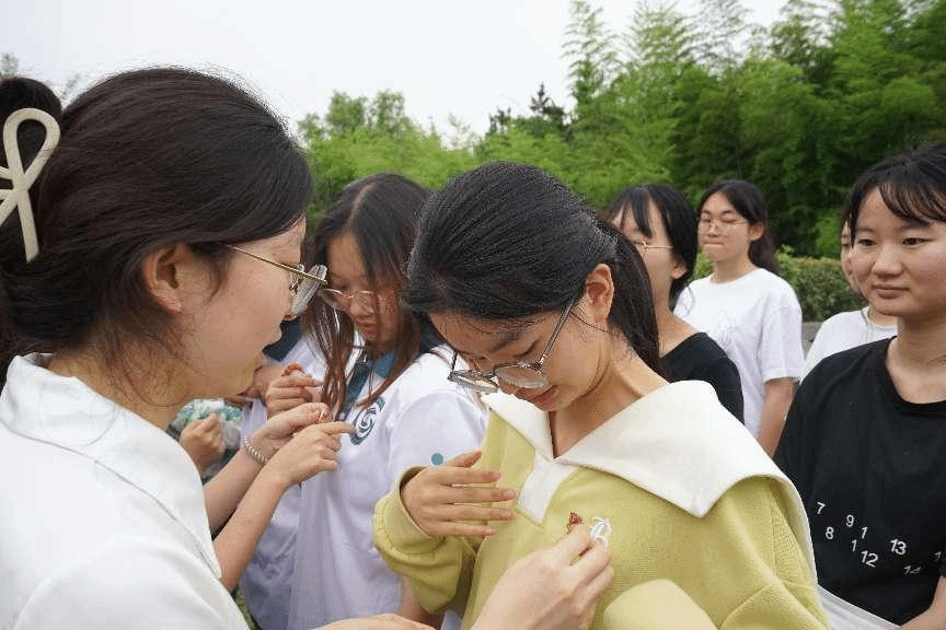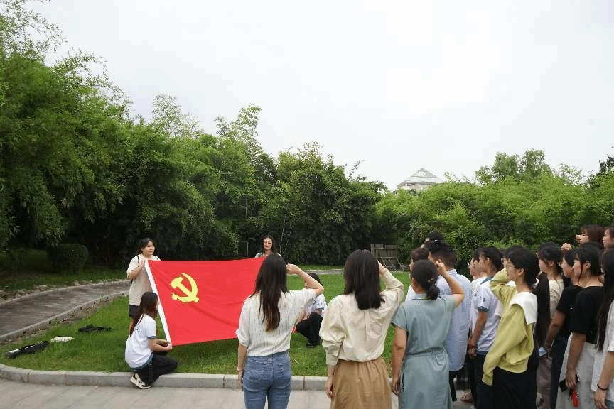 在廉园的许白昊的雕像前,在嘹亮的国歌声后,学院领导和毕业生党员代表为新发展的党员佩戴党徽,毕业生党员夏文新祝愿新党员们不忘初心,砥砺前行。随后,全体师生党员们面向党旗重温入党誓词。
