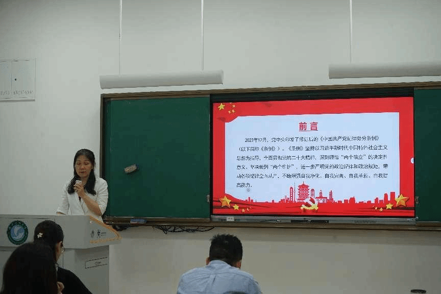 学院党委书记王婧给毕业生党员讲授《学习解读<中国共产党纪律处分条例>》的专题党课。她结合《中国共产党纪律处分条例》修订的背景和过程,着重向在座学子强调了《中国共产党纪律处分条例》修订的重要意义,介绍了条例修订的主要内容,分享党史中的纪律故事。引导全体毕业生党员坚持不懈用习近平新时代中国特色社会主义思想武装头脑,自觉增强“四个意识”、坚定“四个自信”、做到“两个维护”、捍卫“两个确立”,强化党性意识和组织观念。